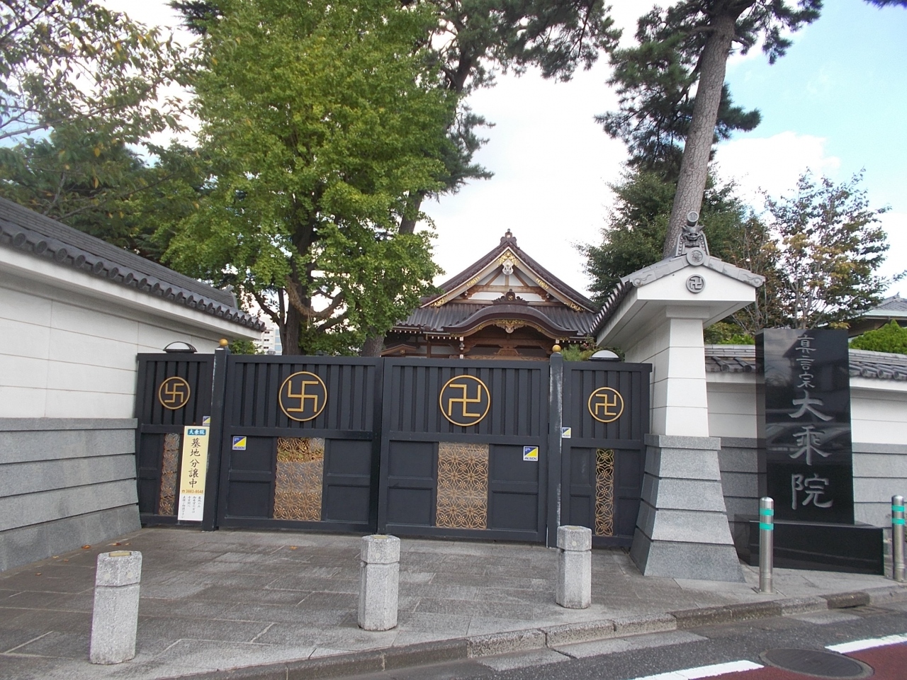 この大乗院は東武スカイツリーラインの竹ノ塚駅から北東に約25分程度の場所にあります。静かな住宅街のエリアにあります。創建は平安時代と言われています。現在は真言宗の寺院です。建物は新しいもので再建されたものです。この寺の南の通りにかつての寺院と山門などが表示されたものがあります。大きな寺院です。すごいです。