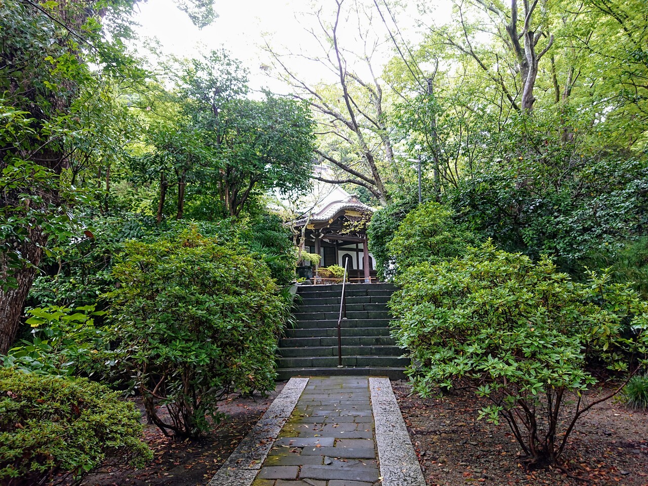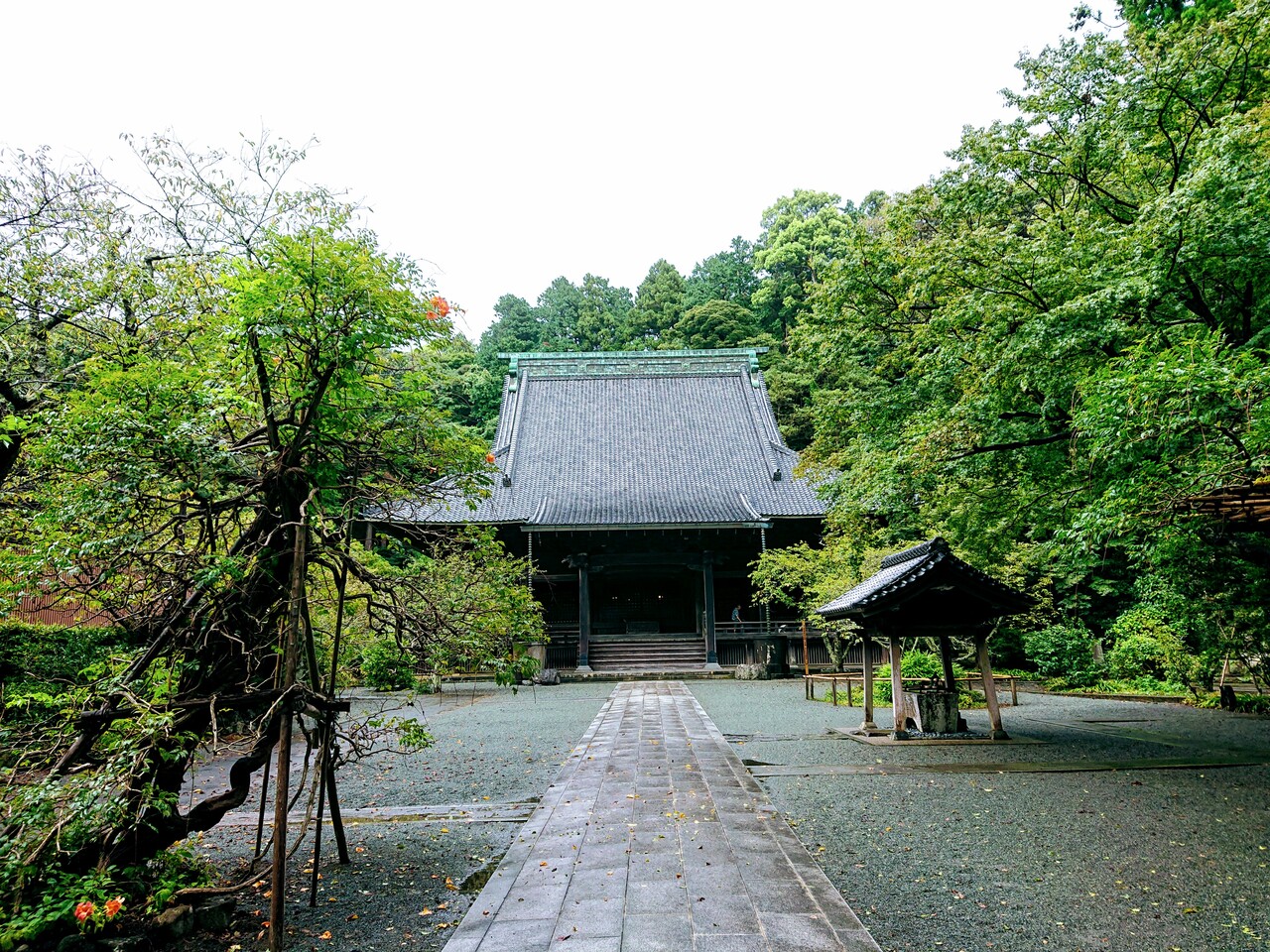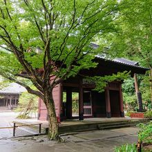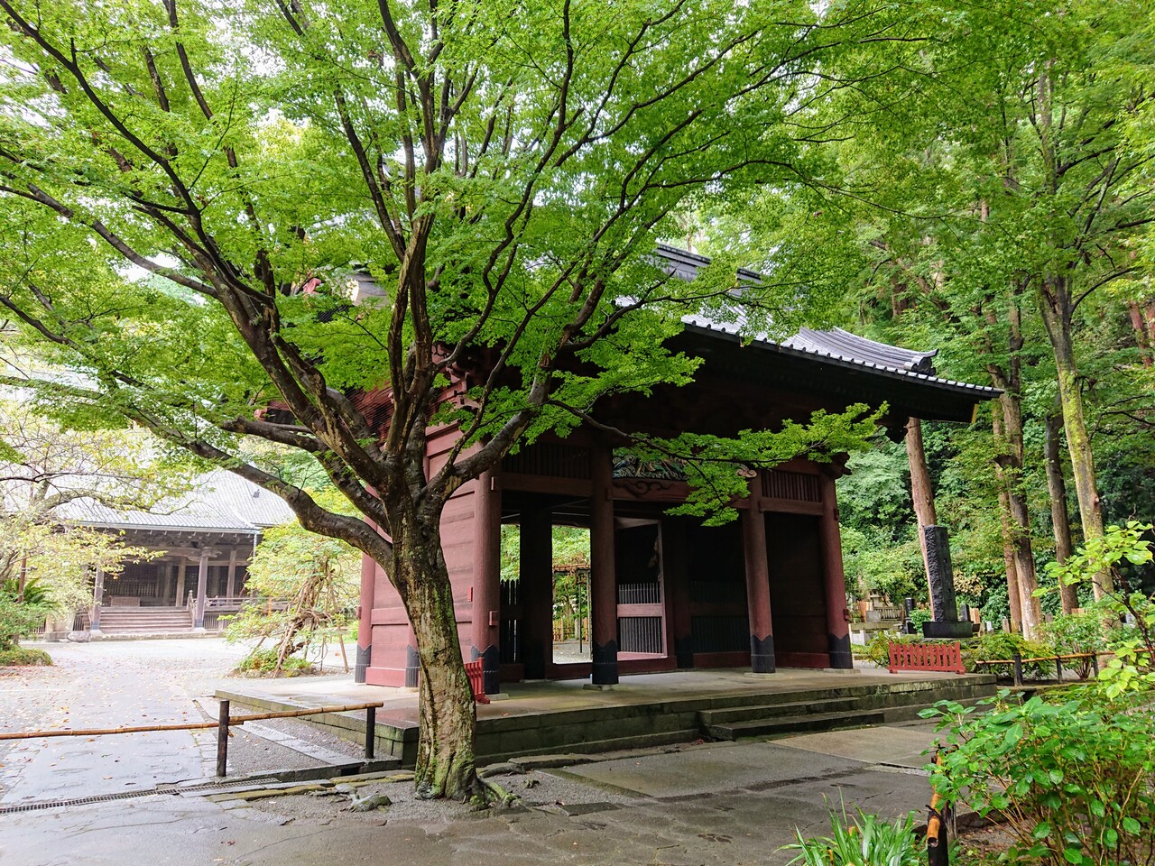森の中には、本堂、八角堂、そして赤く大きな二天門と鎌倉最大規模の祖師堂があります。