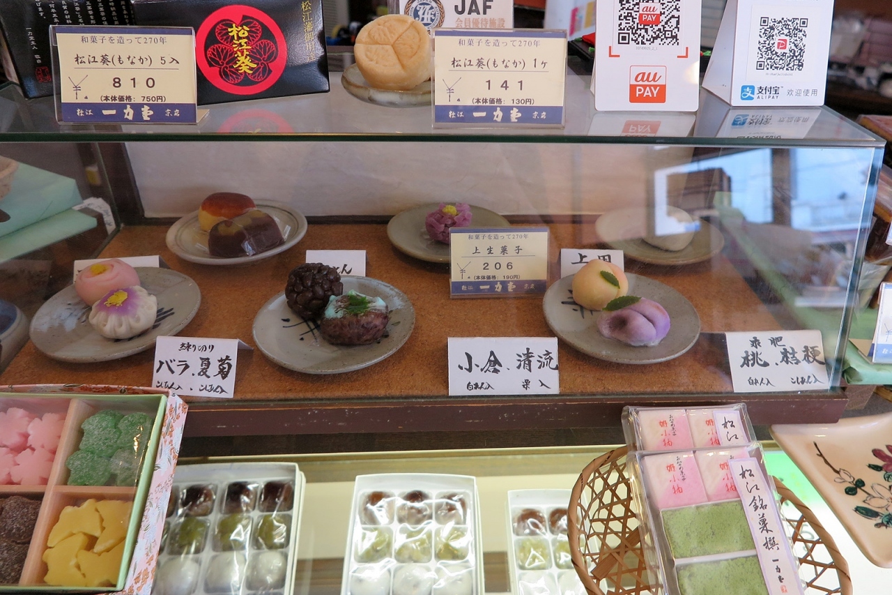 松江の有名な商店街と知って訪れた「京町商店街」ですが、生活感がまったくない上に、観光客の少なさから店を閉じているところが少なくなく、人通りもほとんどありませんでした。ただ嬉しいことに「一力堂」は営業中、世が世なら手に入れられない「姫小袖」を手に入れられましたし。松江についてのお話もうかがえました。