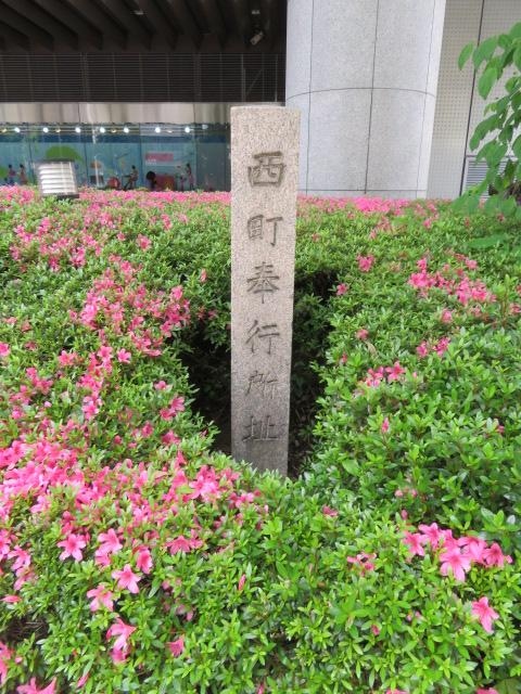こちらの「西町奉行所址」と書いてある石碑は、マイドームおおさかの敷地内の植え込みにあります。残念ながら説明版は消えかけていて、判読不可能です。以前来たときは、愛想のない場所でしたが、今回はツツジに囲まれて石碑も目立っていました。