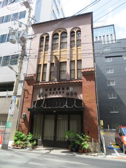 このエリアもレトロビルが多い場所です。1Fの壁に青銅色で「清水猛商店」と書いてあり、その上に「家具室内装飾」とあります。中央にある街灯の辺りから、屋根を吊り下げているような構造がとてもユニークです。壁の色も明るくていいですね。