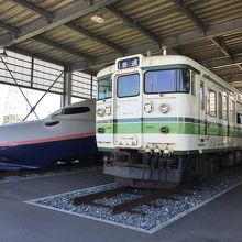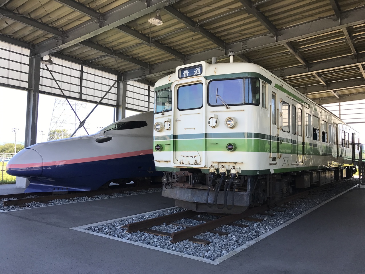 屋外の車両展示は2か所あり、資料館入口にはC57蒸気機関車と新幹線200系が、グランドの方には特急型485-1500番台、近郊型115-1000番台、新幹線E4系(MAX)が展示。どれも新潟、新津にゆかりのある車両ばかり。近郊型115-1000番台は製造以来ずっと新潟に配属されていた車両をこちらに移送したと言うこだわり!日時、車両によっては車内見学も可能。