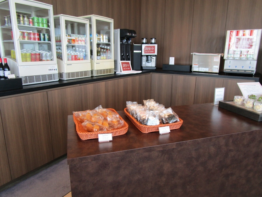 パンやおにぎりは個別包装。コーヒーの自販機は中止。コーヒーやジュース、ビール、ワインは缶やペットボトルの物になっています。個別包装のカップ麺、味噌汁がありました。