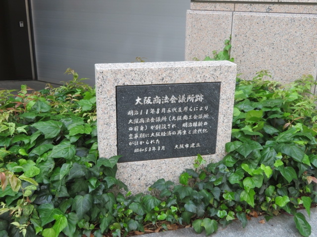 こちらは、淀屋橋の三菱UFJ銀行の敷地の角にあります。黒とグレーのツートンカラーの石碑です。大阪商法会議所は、明治11年に五代友厚らによって創設されました。いわゆる五代様の聖地の一つなので、ファンの方はどうぞ。