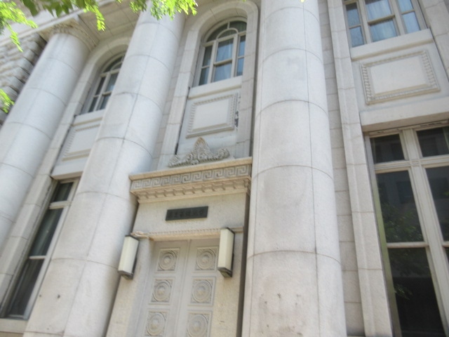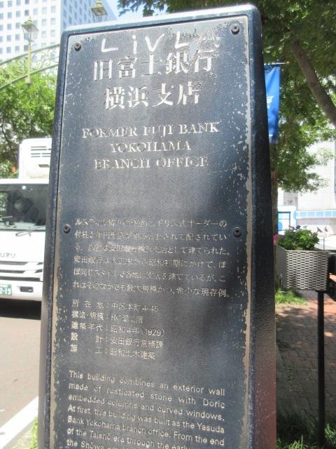 横浜の街歩きで見つけた横浜市認定の歴史的建造物です。入り口付近には案内板もあります。昭和初期に建てられた建物で、もとは安田銀行、そののち富士銀行になったもので、白い丸いフォルムの柱があります。建物全体も白い感じ。どっしりとした雰囲気の建物でした。