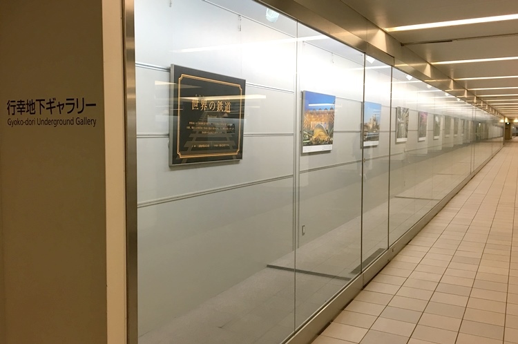 東京駅丸の内側の広々とした地下空間。ふだんはたくさんの人々が行き交うのだと思いますが、休日ともなると人影もまばら。行幸通り地下のせっかくの空きスペースはギャラリーとして活用されているようです。このときは世界の鉄道の写真が両側に飾られていました。