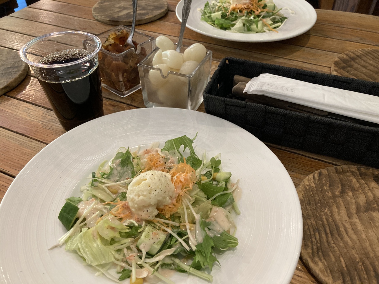 ランチタイムには、プラス300円でスープとサラダをセットできます。コンソメスープの美味しさに驚きました。コーヒーと紅茶もセルフサービスでいただけます。