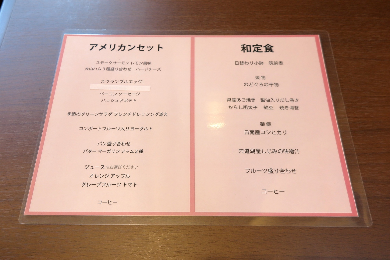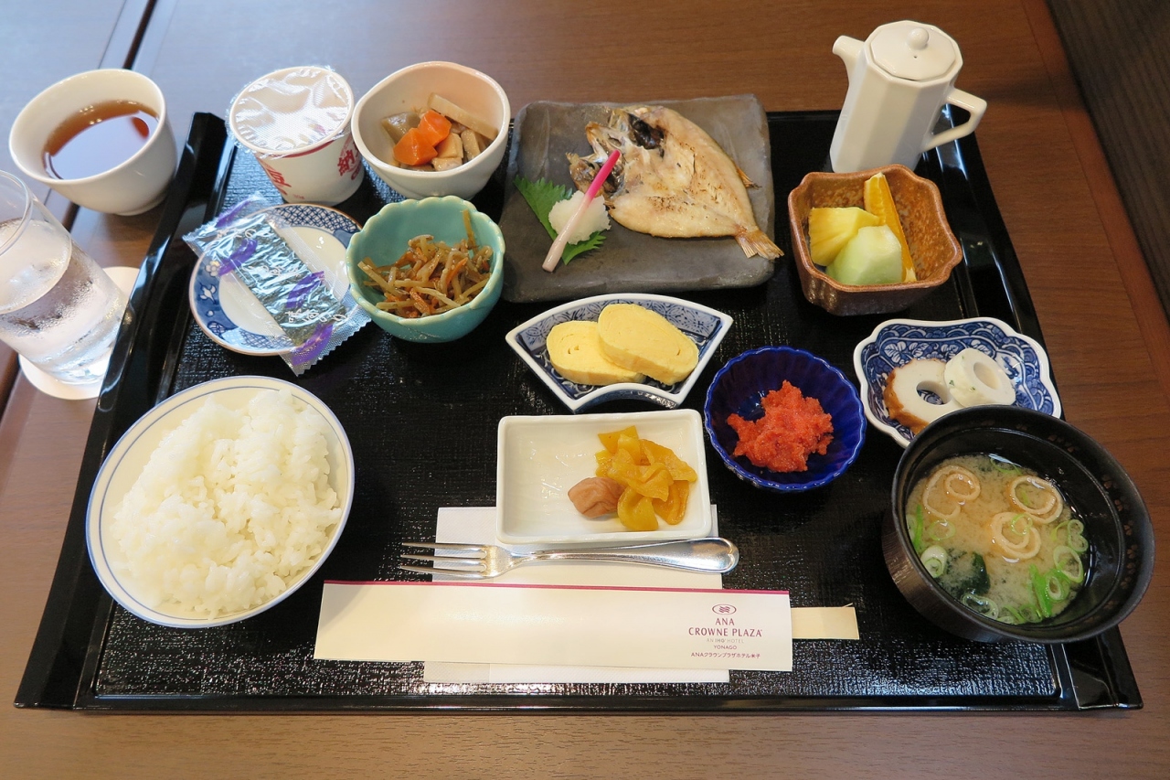 朝食開始時間4分後に入店したら、すでに10人以上のお客さんが着席中でしたが、全員が出張族らしい男性ということもあって雰囲気は落ち着きそのもの、このホテルの雰囲気が分かろうというものです。コロナウィルスの影響でブッフェではなくセットメニューですが、和朝食の主菜はのどぐろという贅沢さ、さすが境港近くの米子、頭に日本地図が浮かびました。