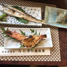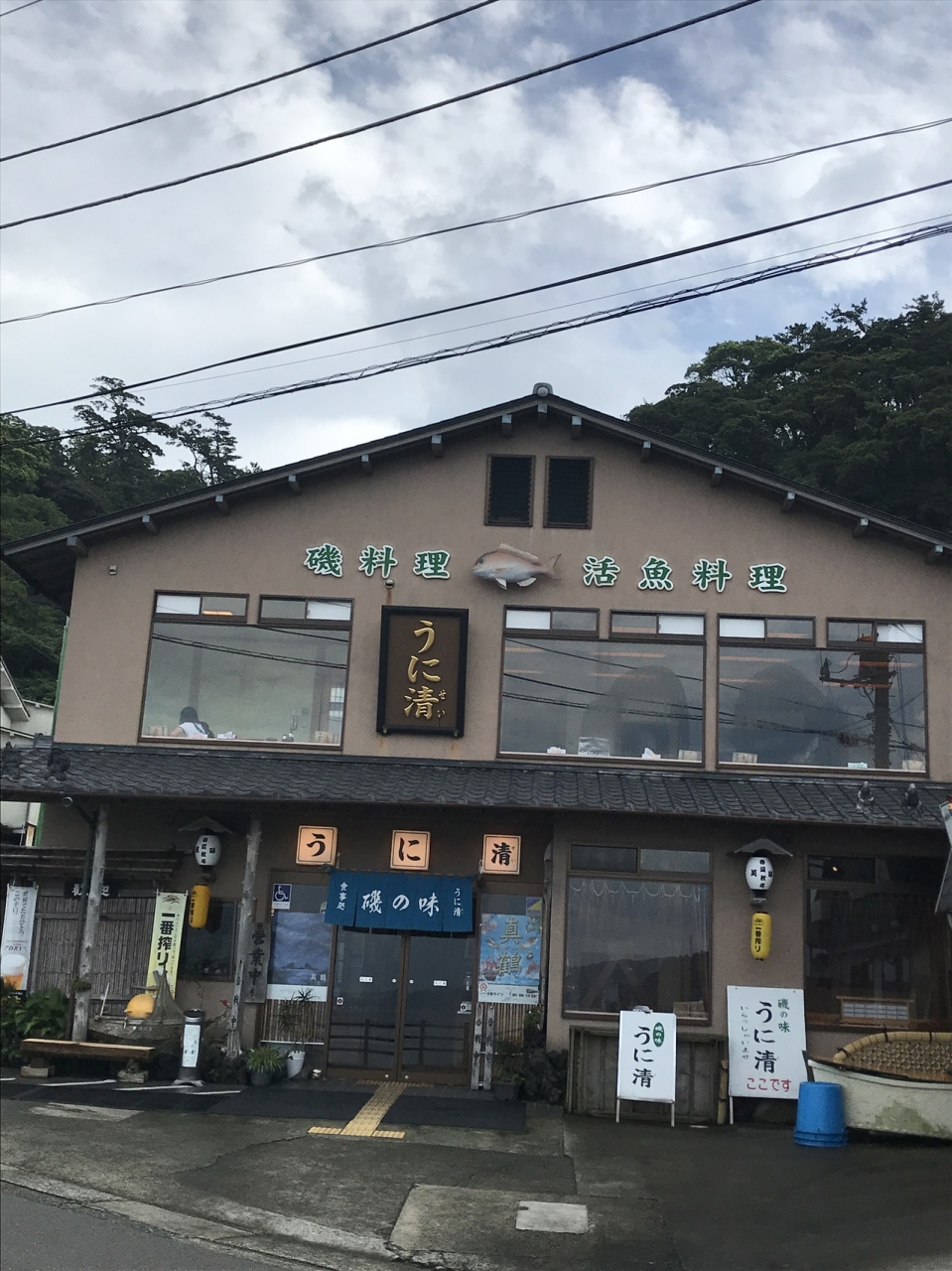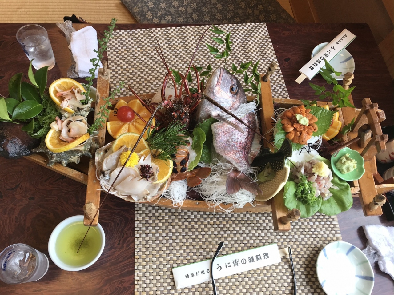 真鶴の海辺にある活魚料理屋さんです。2階に広いお座敷があり、靴を指定された下駄箱に入れてあがります。窓際の席だったので、海がよく見えました。定食のランクがいくつかあります。舟盛りの定食をお願いしました。二人では、十分すぎる量です。鯛や海老は、ピクピク動いていました。鯛の口を触ると噛まれることがあるので、気をつけてとのことでした。舟盛りのほかに魚や海老、サザエの焼き物、ご飯、漬物、海老の頭を入れた味噌汁がありました。