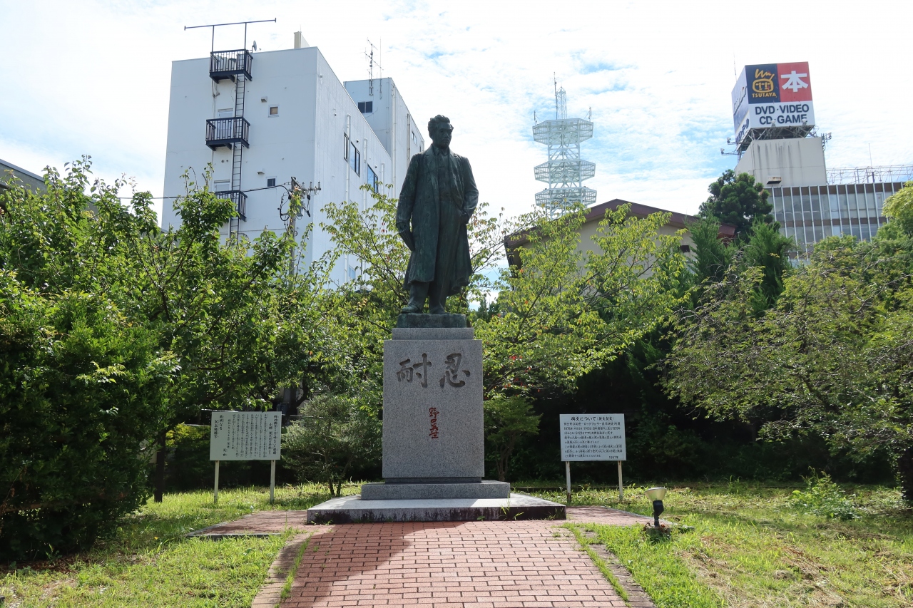 会津若松の中心地にある野口英世青春通りの中程に、世界的な細菌学者、千円札の肖像画にも描かれた野口英世を称える野口英世青春広場があります。最奥に野口英世の銅像があり、「志を得ざれば再び此地を踏まず」と刻まれたオブジェが置かれています。