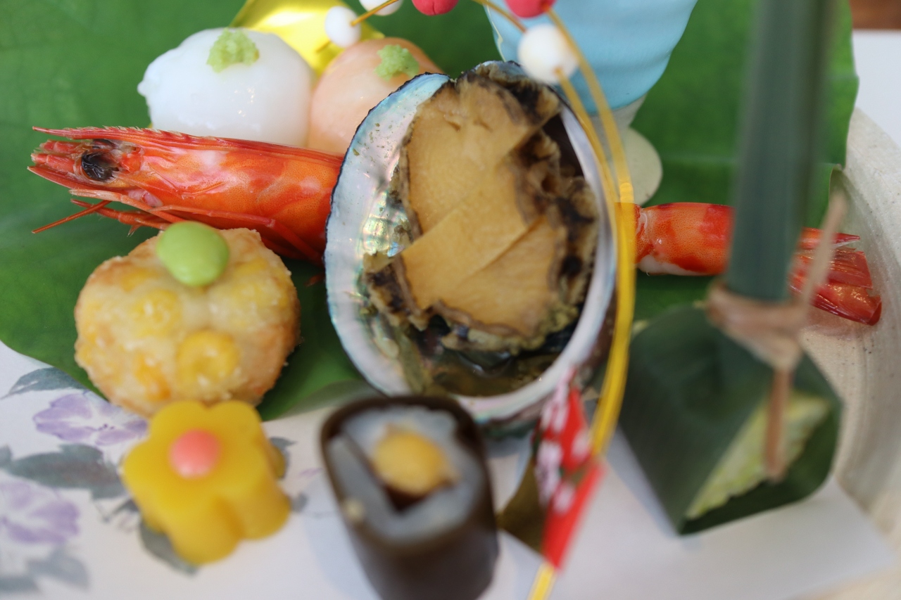 ・前菜はアワビ、車エビ、手毬寿司、とうもろこし豆腐 他