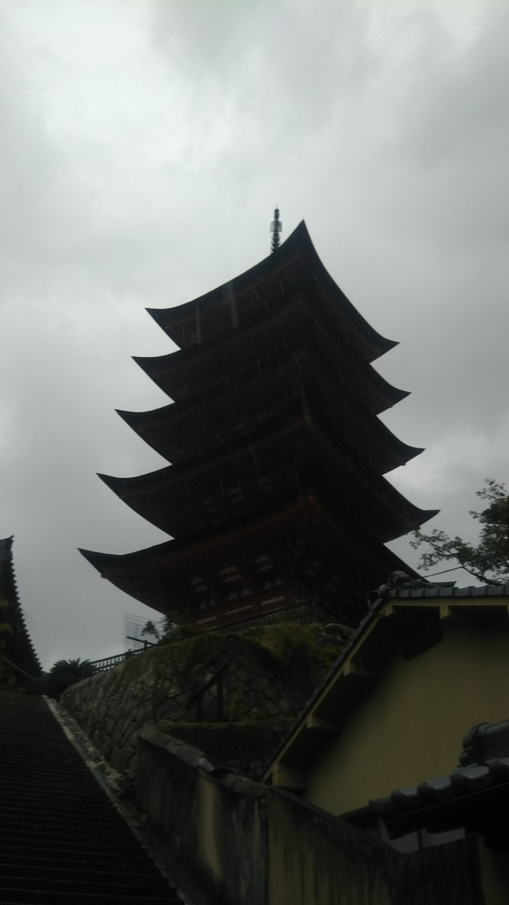 厳島神社から、少し石段等を登り、たどり着きました。室町時代の中ごろに建てられたそうで、重要文化財になっています。参道からもよく見えて、堂々と、そして気品をもって建っていました。雨の中でしたが、美しく見えました。