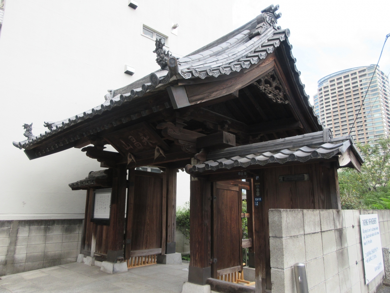 大江戸線・赤羽橋駅中之橋口出口から7分ほど、神明坂沿いに建つ浄土宗の寺です。日向坂沿いに建つ木造の趣ある山門と、山門向かいの広い敷地に建つ近代的なオーストラリア大使館は対照的な姿をしていました。山門正面に建つ本堂の唐破風の天井に描かれた立体的な龍と、唐破風下の壁に描かれた2羽のつるの飾りは、隠れるように描かれている珍しい造りでとても印象的でした。