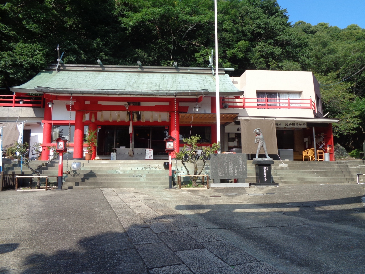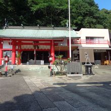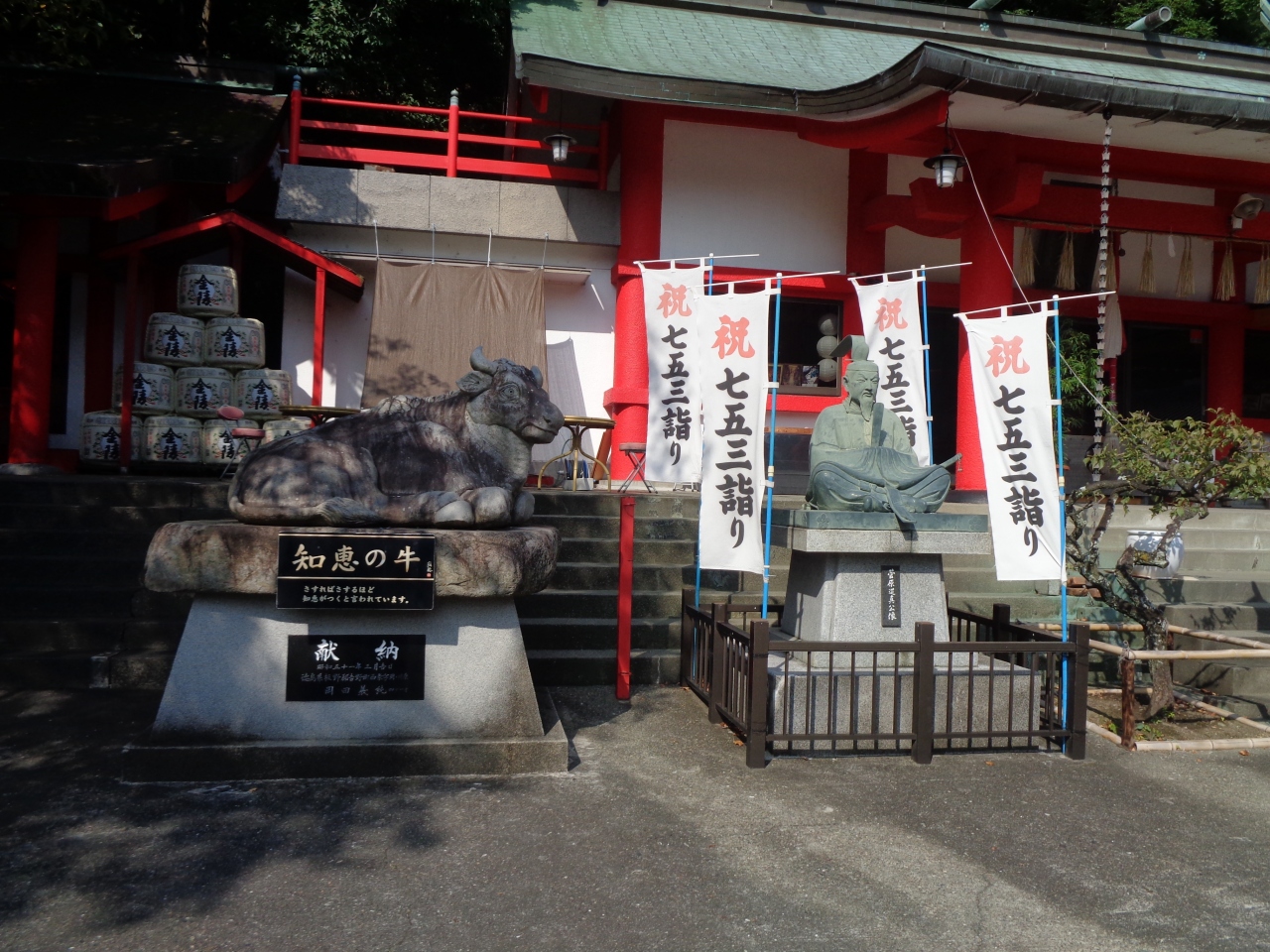 鳥居をくぐって、ちょっとした階段を登っていくと、きれいな朱色と白色の神社があります。天神様ですので、当然、菅原道真公を祀っていますし、本家のように知恵の牛もありました。