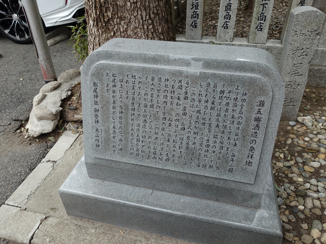 生田神社の境内内にある松尾神社の鳥居の脇に「灘五郷酒造の発祥地」の石碑があります。松尾神社は、酒造・農工業の神であり、石碑の最後には「松尾神社 御際神 大山咋命」と記されています。酒づくりが盛んな神戸ならではの石碑と感じました。