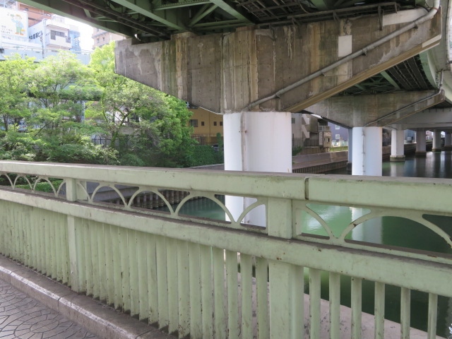 東横堀川にはたくさんの橋が架かっていて、この農人橋もそのひとつです。昔は上に高速道路が架かっていなくて景観も良かったのでしょう。ただこの橋は橋の上から見ると、高速道路の橋桁と重なってちょっとユニークな光景になってます