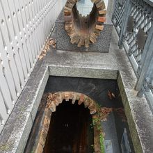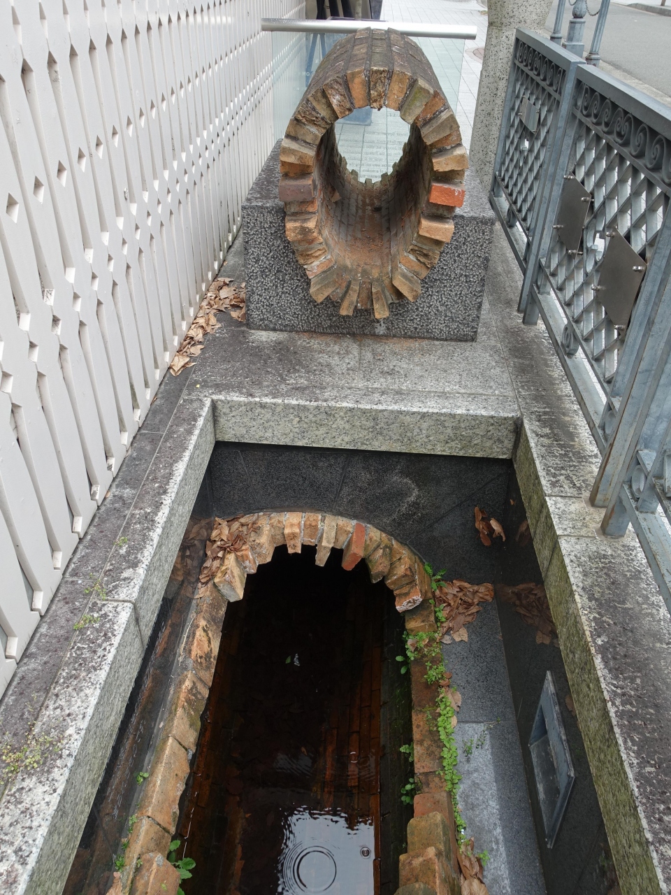 「旧居留地下水道公開施設」は、旧神戸居留地十五番館のすぐ前、歩道の一画にあります。案内書きによると、明治5年頃に完成し、日本の近代下水道では最も古いものということです。柵の前には文化財の指定を印すプレートなど、3種類のプレートが設置されており、旧居領地時代の歴史を今に伝える重要なものであることが分かります。