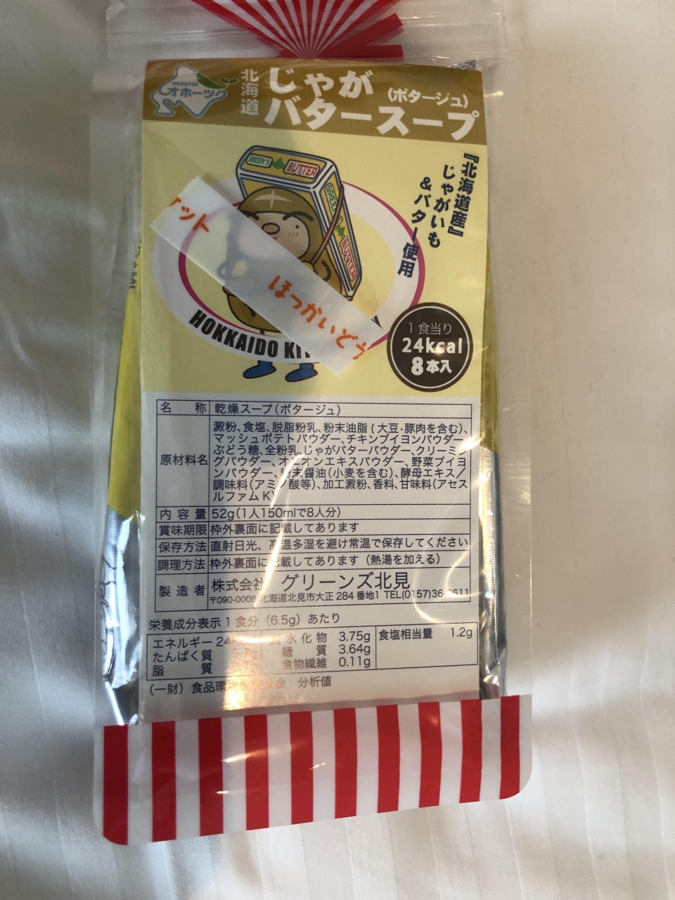小倉駅が目の前の、大変便利なI’mの地階にある、北海道のアンテナショップです。お気に入りは「じゃがバタースープ」356円。スティックタイプの粉のスープが、8本入っています。お手軽、濃厚で美味しいです。ごぼうスープ、オニオンスープもあります。