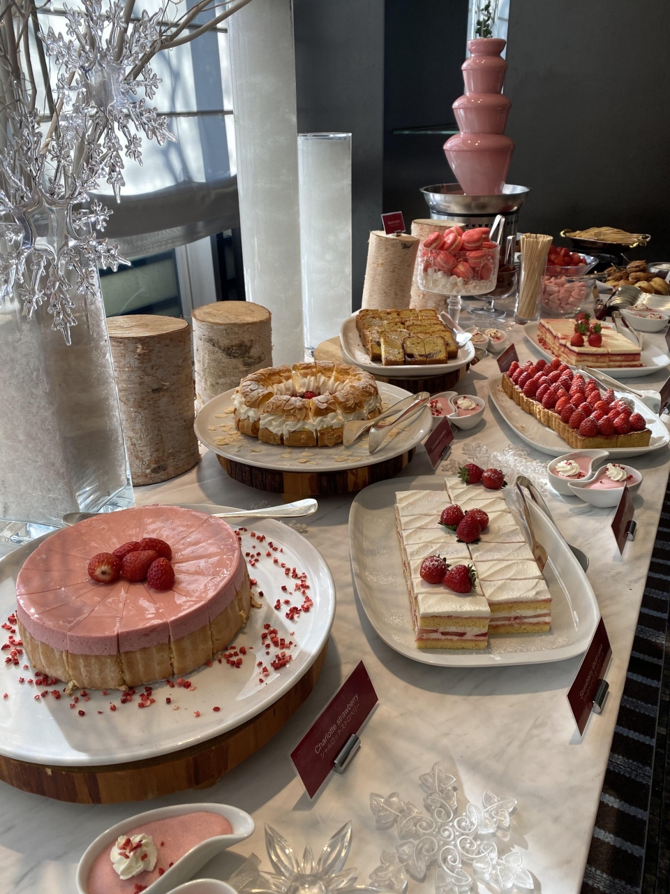 アフタヌーンティー開始時間に予約したので、ビュッフェにまだ誰も手につけてない状態であり、暗黙の了解のようにお客さんたちがゆずりあってまずは各々が撮影してました(笑)いちごのピンクに染まったビュッフェ台はとても可愛いです。