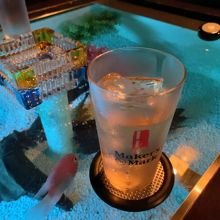 テーブルが水槽になっているバーでした。店内の薄暗い照明と水槽の明るさが、良い感じを出していました。店は地下1Fで階段で降ります。2軒目に行く店なので、酔っぱらっている可能性大。足元注意です。