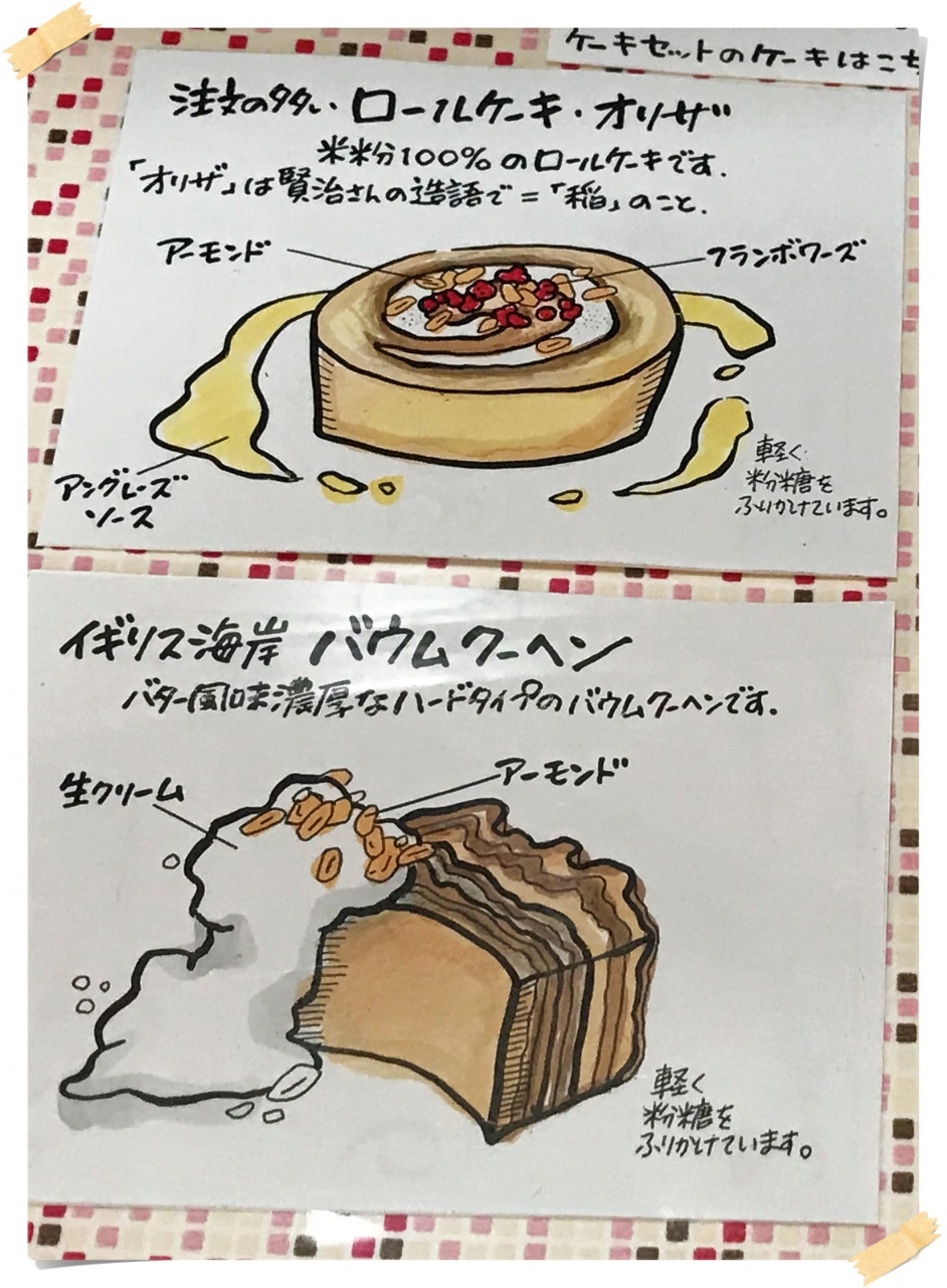 ケーキは宮沢賢治の童話に因んだ名前がつけられていて、注文の多いロールケーキ・オリザや英国海岸バウムクーヘンなど。