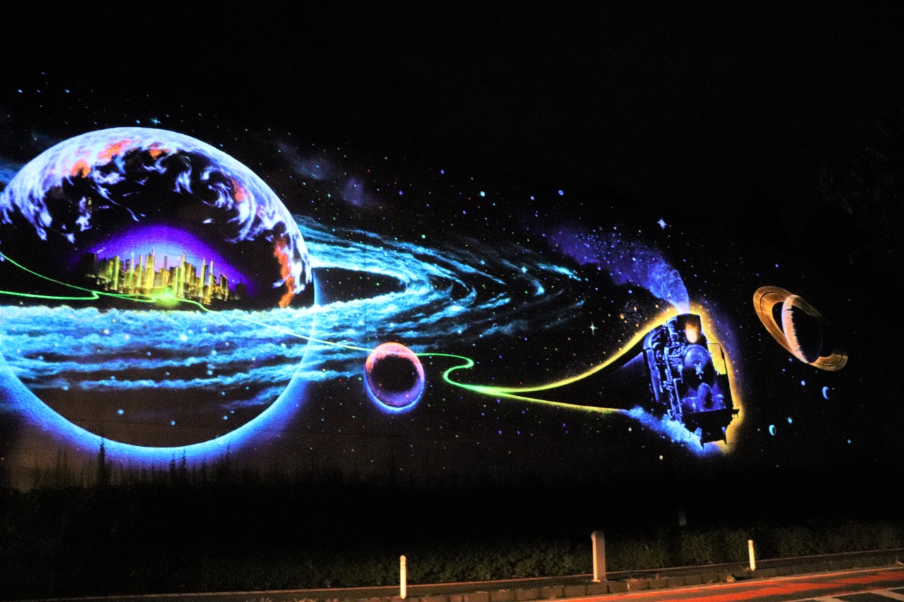 未来都市銀河 地球鉄道壁画は夜になるとブラックライトに浮かび上がる銀河鉄道の壁画で、壁画があるのはJRF花巻駅から5分ほど歩いた場所。