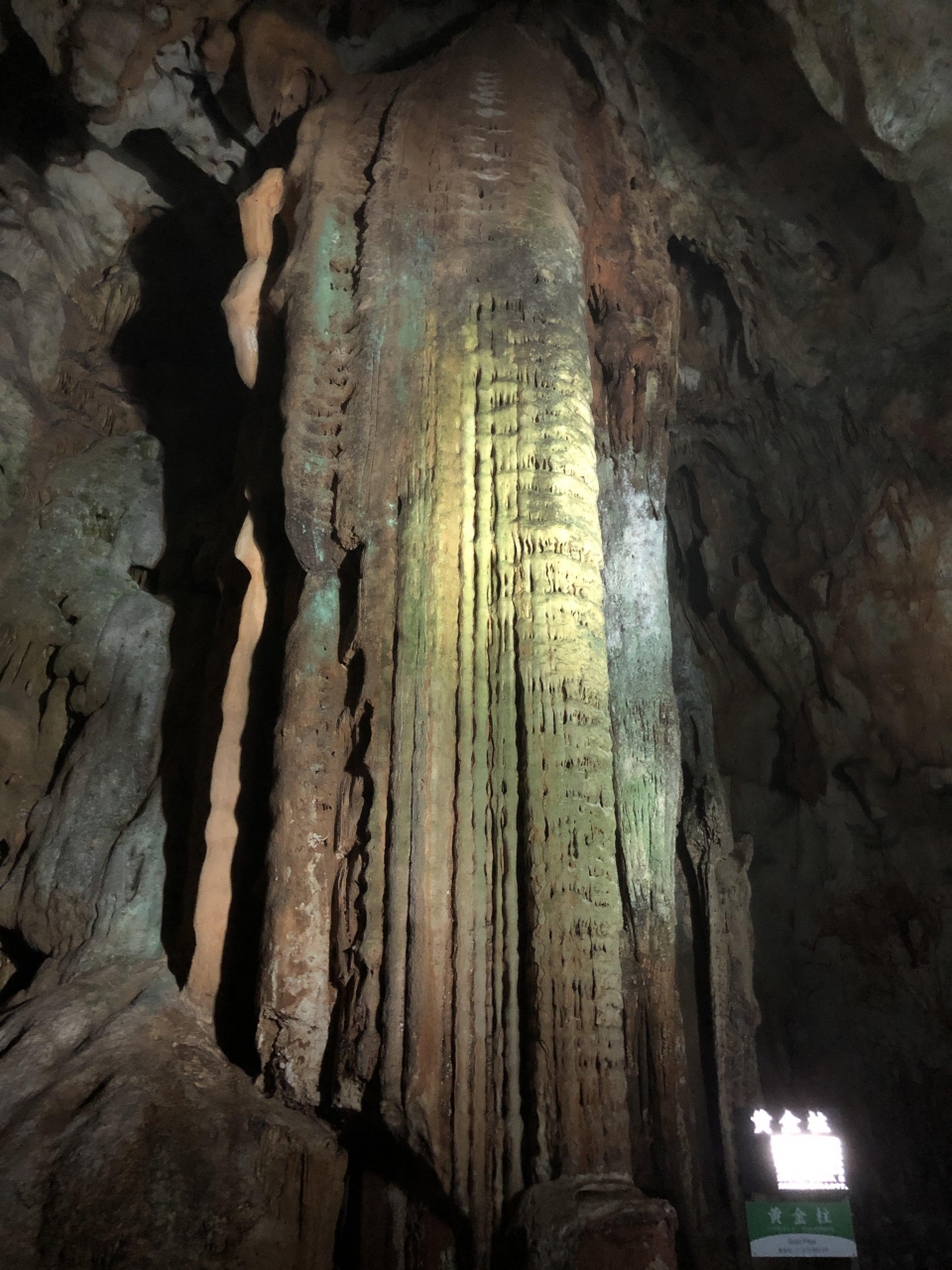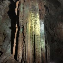 秋芳洞内で見学できる高さ15mの大型のフローストーンです。今回は黒谷口から入ったのですが、「くらげの滝のぼり」や「巌窟王」の先にありました。その名のとおり黄金色にライトアップされていて、圧倒されました。洞内のほかのスポットよりも、足を止めて見ている人が多かったように思います。