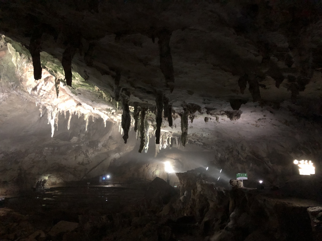 今回は黒谷口から秋芳洞に入ったのですが、黄金柱の次あたりにある、大きな空間にありました。天井から垂れ下がった石灰分のかたまりである「つらら石」が、天井から無数に下がっている傘のように見えます。だだっぴろい空間につらら石が下がる風景はなんとも幻想的でした。