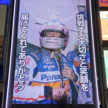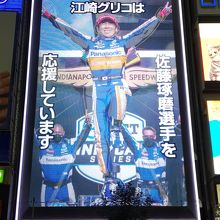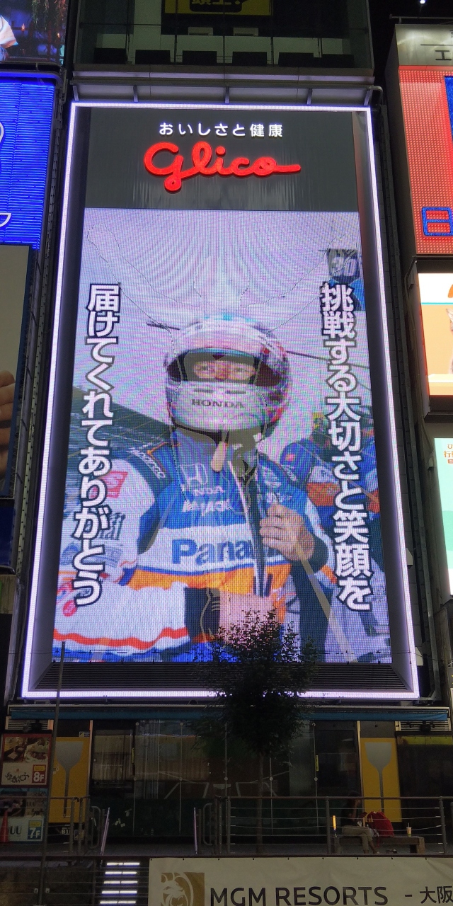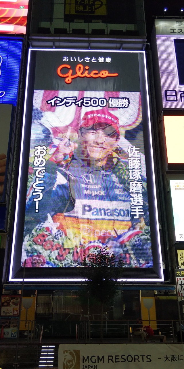 グリコのネオン看板は道頓堀川のそばにあります。アメリカンレースの最高峰、インディ500で2度目のウィナーになった佐藤琢磨が期間限定で見ることができました。夕方日没以降で15分ごとに約30秒間だけ出てきます。なかなかレアでした。
