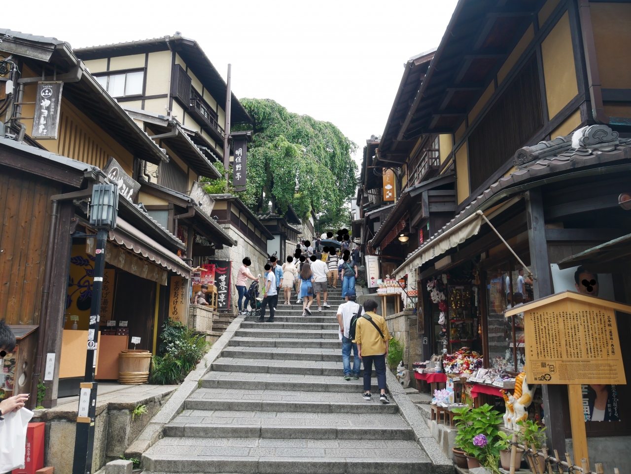 八坂神社から清水寺へ向かう道にある坂。短い坂ですが、3メートルのほどの狭い道の両側には京都らしい建物のカフェやお土産屋さんが並んでおり、とても風情のある通りで、散策にはちょうど良い通りだと思いました。昼間は多くの人がいましたが、朝の人が少ない時期のほうがもっと良い景色が見られるかもしれません。