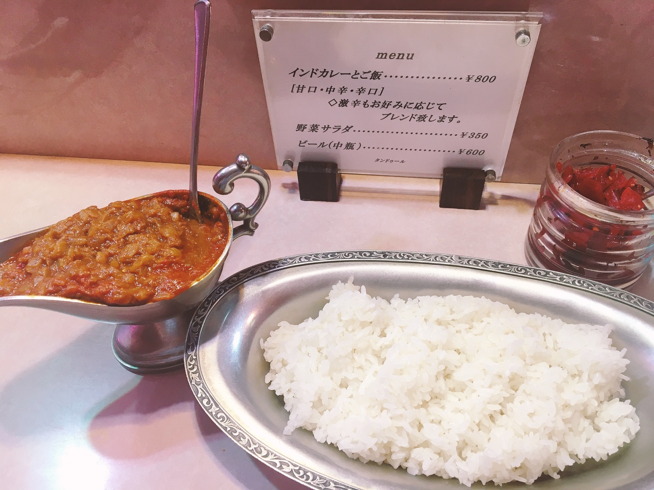 メニューは基本カレーライスのみ。800円税込。辛さは普通、中辛、辛口の3段階から選べるが別記載の激辛を希望すると何と100倍まで選択可能。