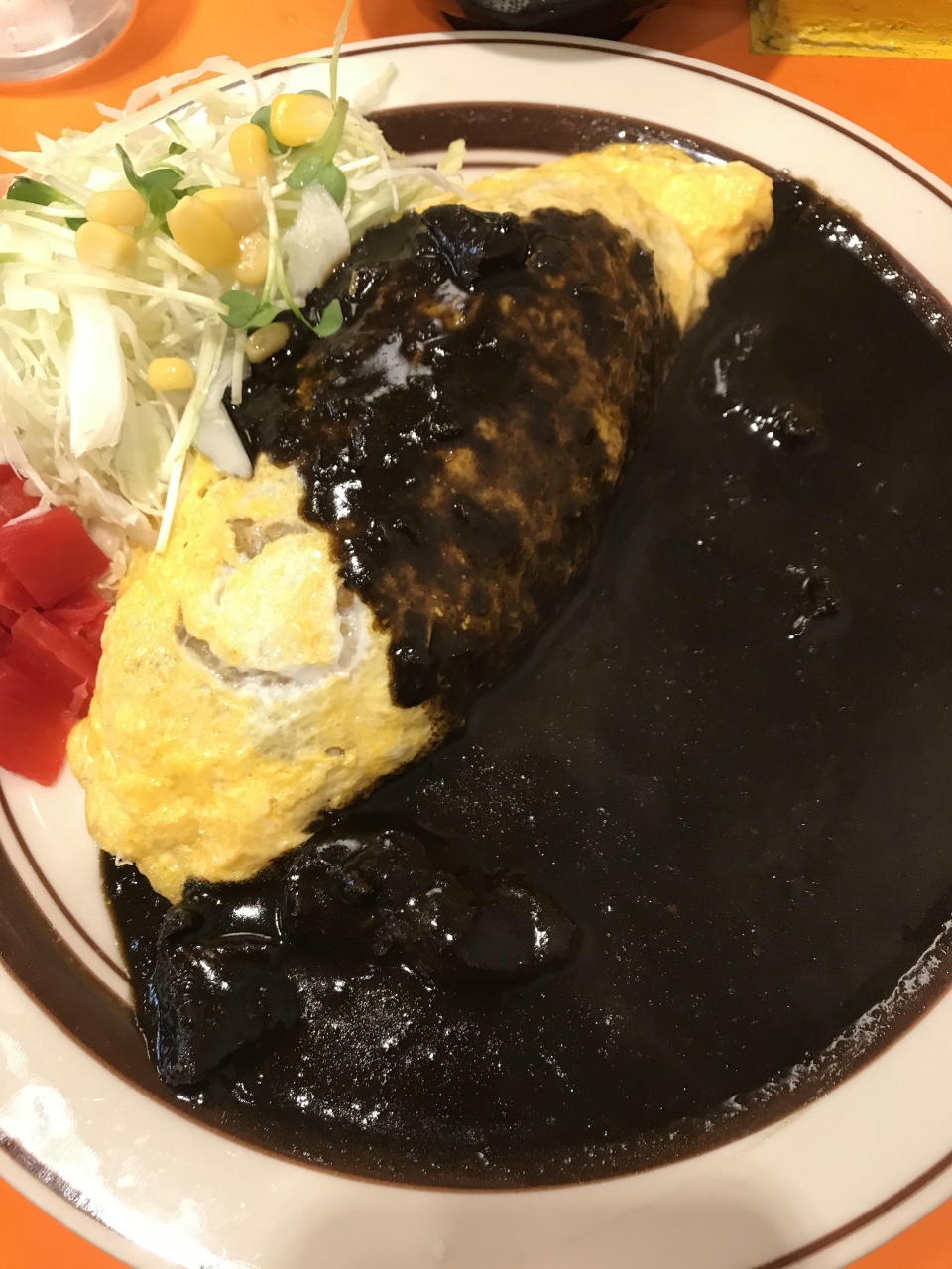 ドライカレーのオムライスの卵は薄め、カレーは真っ黒で濃厚。