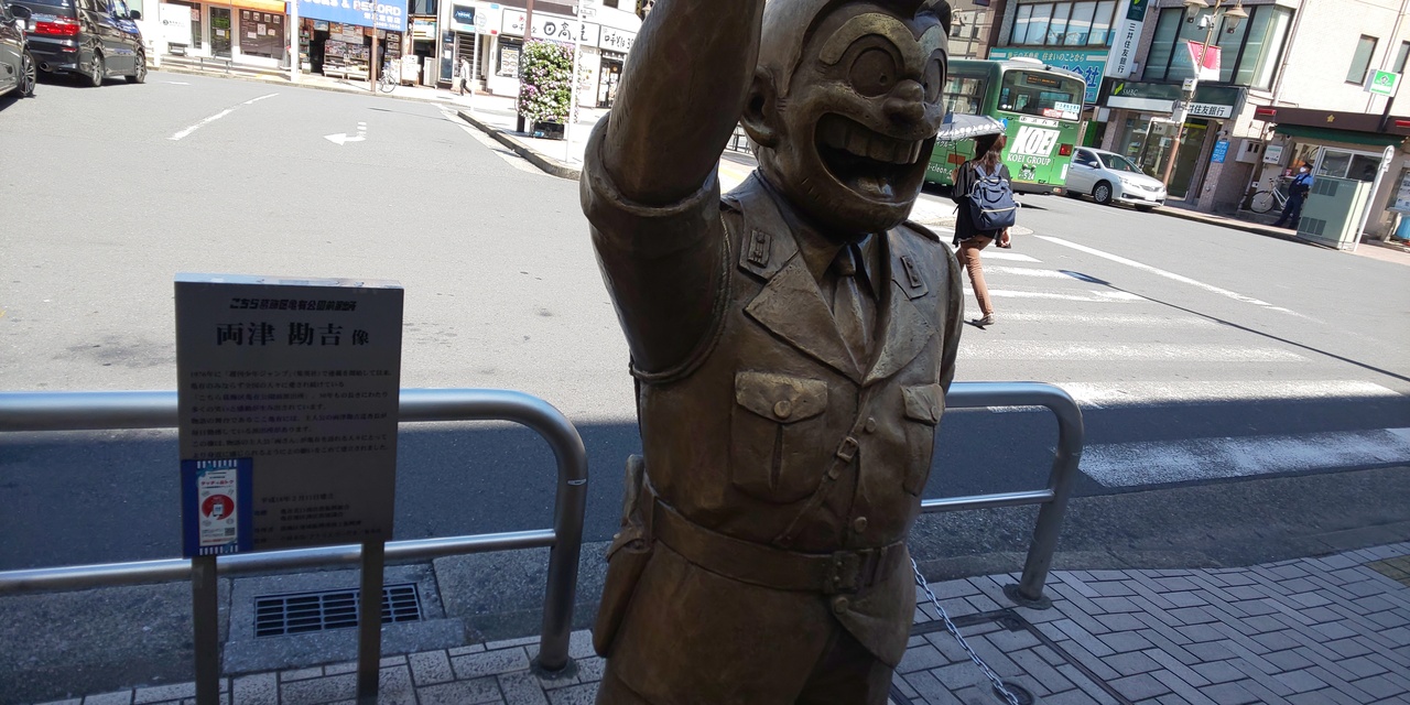 亀有の駅前にいます。亀有駅周辺にはたくさんの両さんの像がありますが、これがいちばん有名な像です。