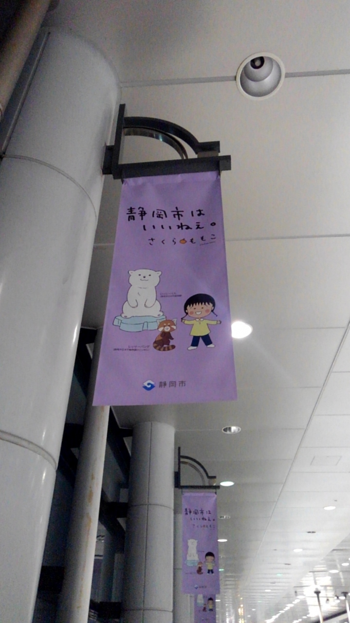 ただ、この駅の良かった点は歩く歩道があったことと、ちびまるこちゃんの旗みたいなものが駅にたくさん飾られていたことが良かったです。