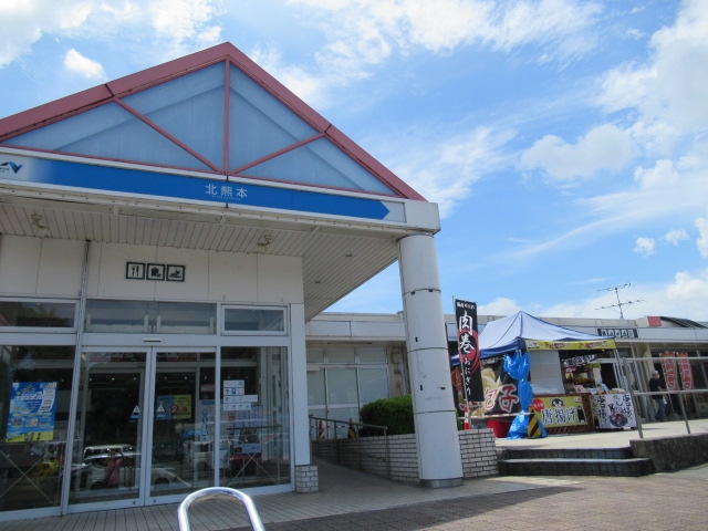 熊本県のほぼ中央に位置する「北熊本サービスエリア」へ立ち寄りました。ワンポイントにオレンジ色を色替えすることでブルーとマッチングし趣ある新鮮な感じの外観です。九州道の中でも歴史あるサービスエリアのようでやはりイチオシはくまモングッズコーナーですね。大人から子供まで楽しめる愛くるしいくまモングッズは、空港よりも多く販売されています。その中でお土産に幾つか購入しましたが特にTシャツ、縫いぐるみは喜ばれました。またフードコートもありますよ熊本特産のラーメンや高菜入りチャーハンが人気のようです。