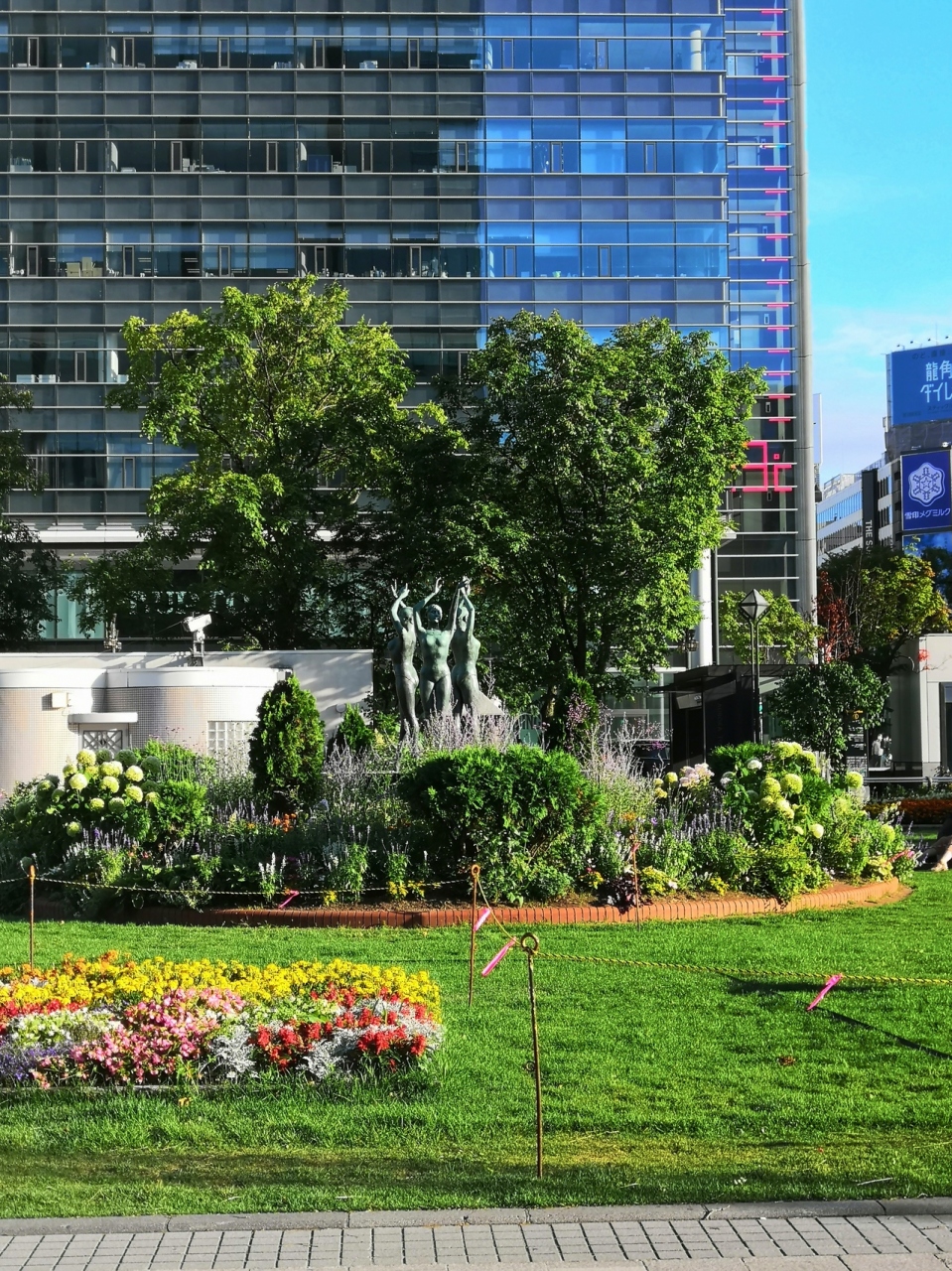 大通公園の中でも札幌駅前通りに近い、人通りの多いエリアにあります。ニッカウヰスキーの寄贈で設置されたそうですが、ウイスキーには関係ないものというのが条件だったそうで、よく見ると踊り子さんたちらしくトゥシューズを履いています。彫刻の永遠性意識した作品だそうですが、それが感じられます。