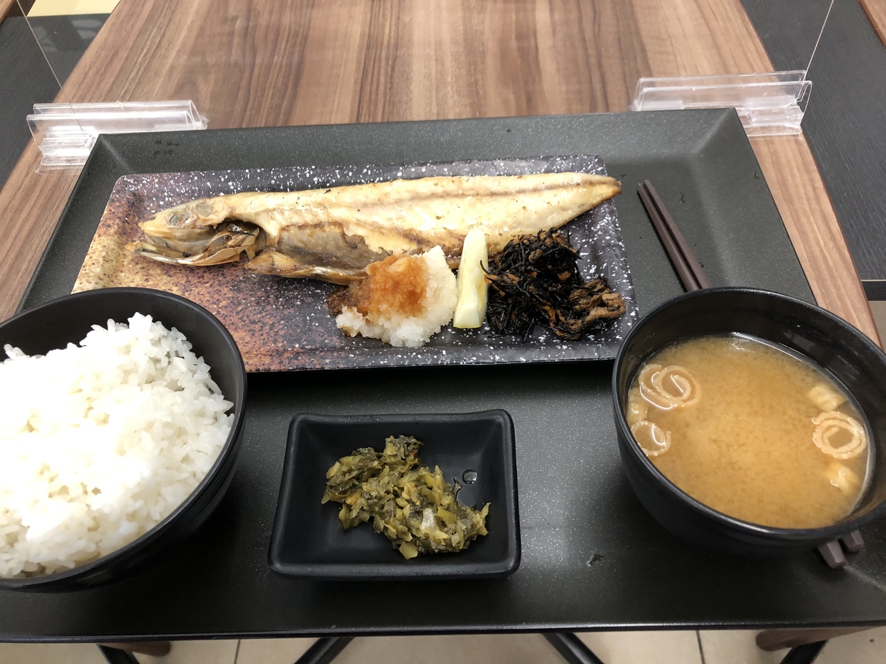 海老名サービスエリアでの朝ごはん。しっかり食べたいので探していると気になる看板が。和食を食べたい気分だったのでここに。焼き魚と蕎麦を提供している店のようです。今回は、サバの焼き魚定食をいただきました。サバ以外にもホッケもあります。