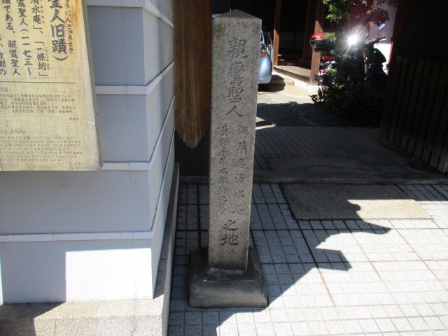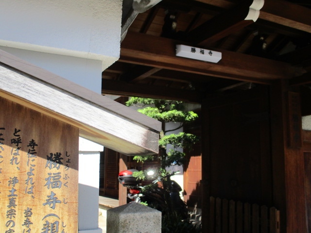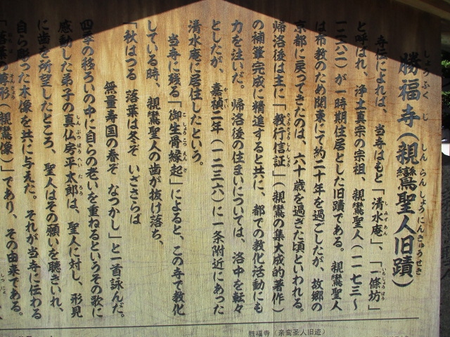 勝福寺は中立売通にある浄土真宗の寺院です。親鸞聖人が一時期住居にしていたそうです。布教のため関東で約20年過ごした後故郷の京都に戻ります。60歳頃です。親鸞聖人の抜けた歯を弟子に与えた話で知られています。山門は開いていましたが、観光寺ではないので、入るのを遠慮しました。山門と説明板を拝見しました。
