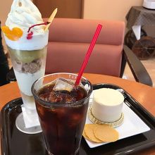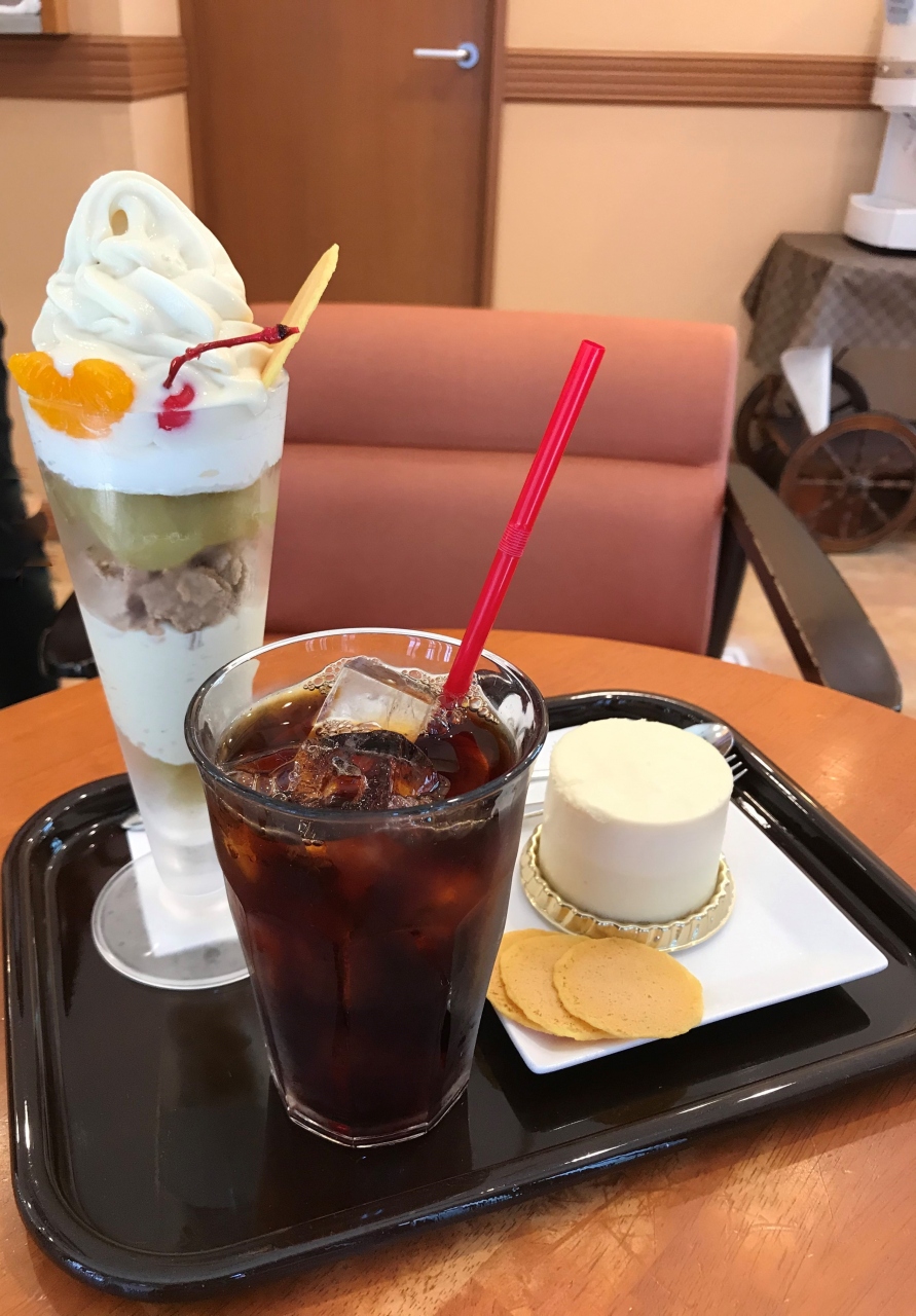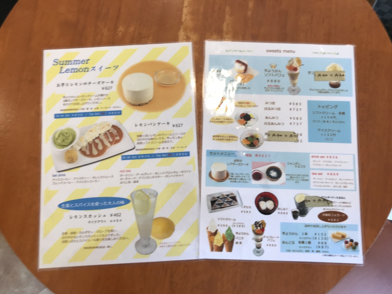 舟和と言えば和菓子店ですが、こちらのカフェでは、パフェやケーキ、プリンなどの洋菓子がいただけます。洋菓子にも芋を使ったメニューがあり、その中から芋ようかんソフトパフェ、お芋とレモンのチーズケーキを注文しました。芋を使っているので、とても濃厚な味で美味しかったです。