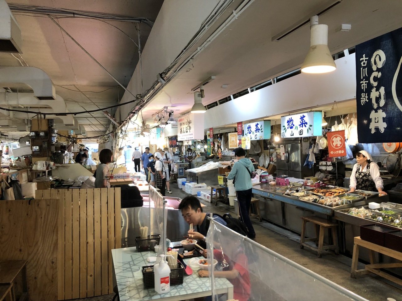 最初に2000円分のチケットを購入し、100円分をもぎりながら市場内を巡回し丼ぶりを完成させていくといったスタイル。