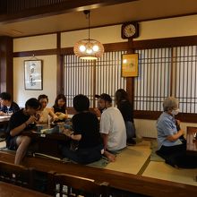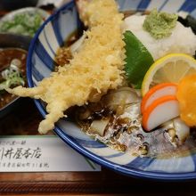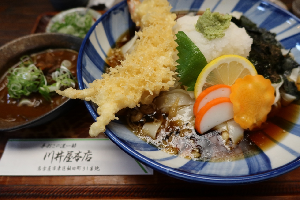 店内は座敷席とテーブル席があり、昔ながらのきしめん店と言った雰囲気。頂いたのは一番人気の海老おろしきしめん。大きな海老天と大根おろしが相まって冷たいきしめんの味が更に際立ちます。久々に美味しいきしめんを頂けました。