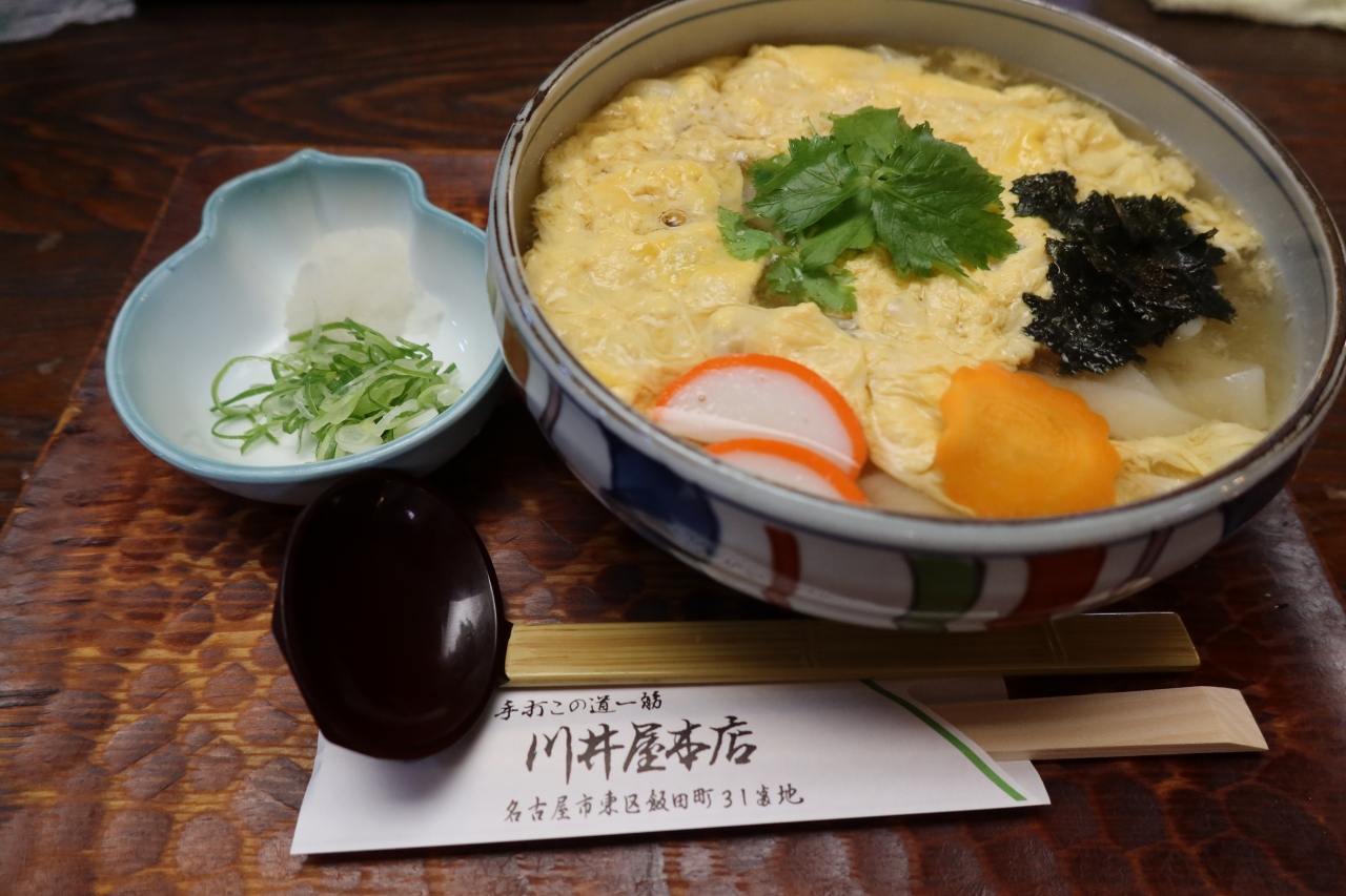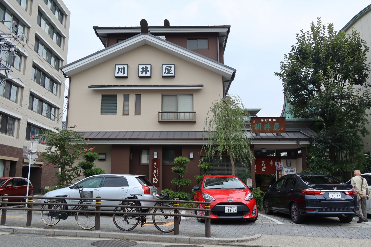 外堀通りの飯田町交差点を二葉館側に入った一つ目の交差点角に川井屋本店はあります。大正時代創業のきしめん店で、土曜日の昼に訪れると店先で入店待ちの人が6人程。人気店のようです。