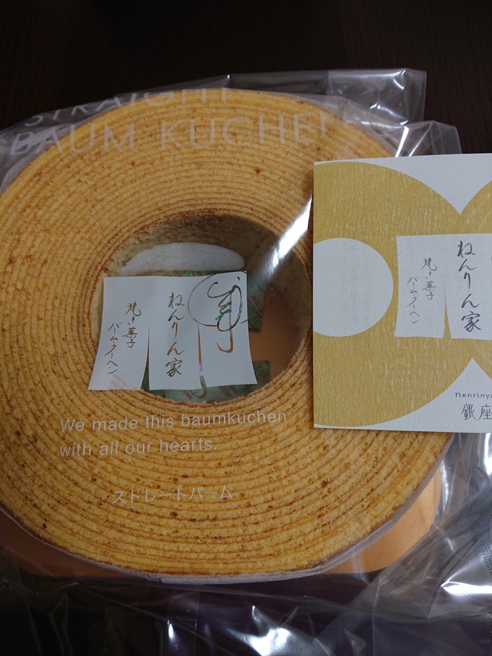 東京ではなく、今回は神戸阪急のバウムクーヘン博覧会にて購入しました。ねんりん家はすごく有名なお店です。こちらは、バームクーヘンと呼んでいる様ですね。しっかりとした生地で、シンプルな味は誰もか喜ぶ美味しさです。