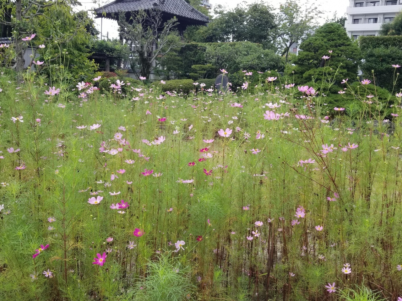 寺院はコスモスが咲き乱れていてとても綺麗だった。