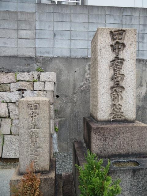 上本町の寺町の妙壽寺の前に「田中金峰墓所」と書いた石碑が立っています。境内の墓所に「田中有馬三郎墓」と書いてあるお墓がそうです。彼は、立派な儒学者かつ医者で貧しい人も見てあげた立派な方なのに、お墓は小さく質素なものでした。境内の可愛いお地蔵さんは、金峰先生にお世話になった子供のイメージです。