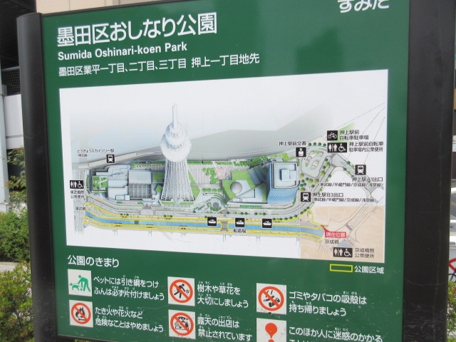 東京スカイツリーからほど近い場所にある公園です。公園といっても遊具があるような公園ではなく、川沿いに広がる450メートルほどの場所ですが、きれいに整備されています。北十間川沿いに親水公園としてあって、スカイツリーも見えてきれいですし、船の乗り場があったりもします。