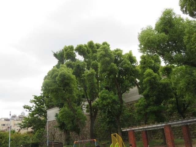 高津公園は、位置的に言うと、高津宮の下にあります。公園に「高津宮」と書かれた石碑があって、その横の階段を登っていくと、高津宮に到着です。公園から見ると、高津宮の下の部分が城壁のようになっていて素敵な景観です。