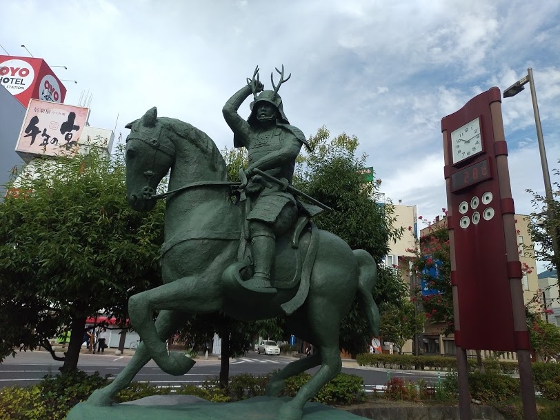 JR上田駅の駅前、上田城跡口の方にありました。駅前広場のど真ん中に鎮座していました。徳川家を相手に奮戦した真田幸村公、その活躍ぶりを想像するに値する銅像でした。