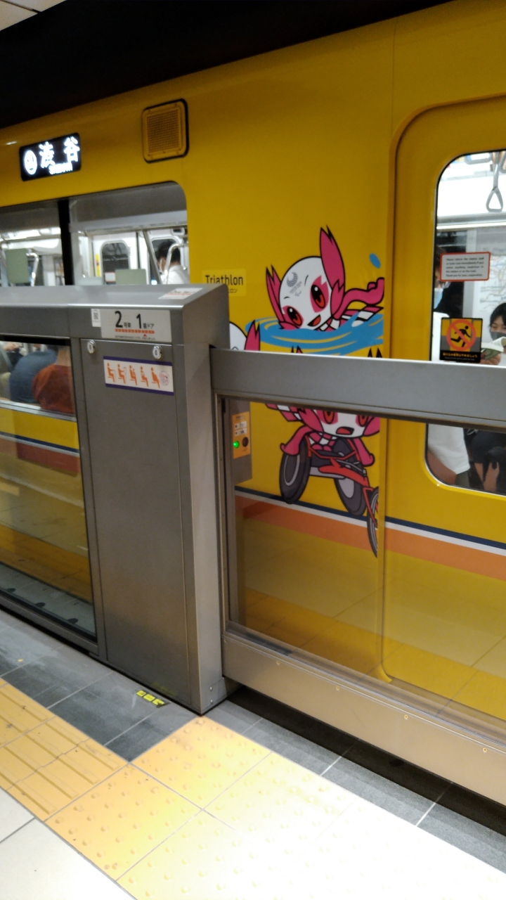この時は通常タイプの銀座線の車両だったのですが、ドア脇のスペースに車椅子でのマラソンや球技などをする東京五輪のマスコットが描かれていて、少しだけ楽しげでした。
