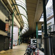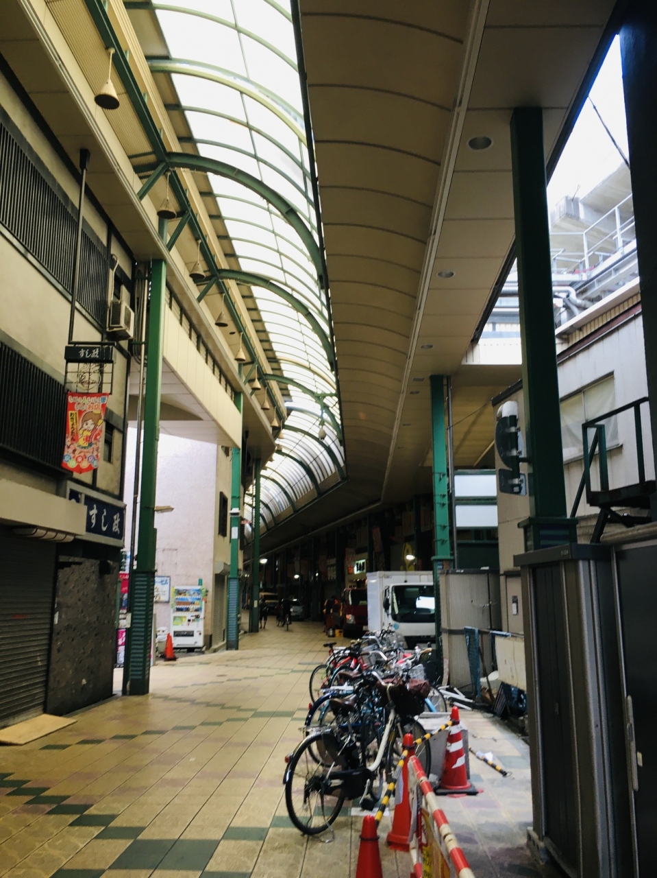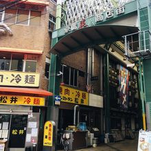京橋駅付近にはたくさんの商店街がありますが、車一台ぐらい通れる広さの道幅でアーケードになっていて、天井から光が入る以外は街灯の明かりはないので少し暗めの雰囲気でした。出入口の焼肉・冷麺屋の店の看板が目立っていました。